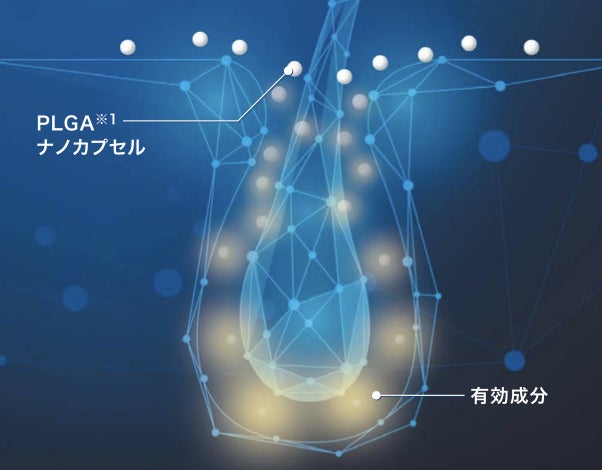 「ナノインパクト」はこのPLGA*ナノカプセルを用いて、皮膚・毛穴の奥深くまで有効成分を届ける”浸透力”と、皮膚・毛穴で成分をゆっくり放出し続ける”持続力”を大きな特徴とし、薄毛で悩む多くのお客様に愛用されてきました。