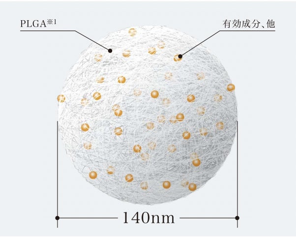 その研究成果を活かし、肌や頭皮が求める要素を、PLGA*ナノカプセルという直径約140nmの微細なカプセルにつめこむことに成功しました。この140nmの大きさは、毛穴の大きさと比べると約200万分の1。仮に毛穴を野球場に例えるとなんと野球ボール1個よりも小さいサイズになります。