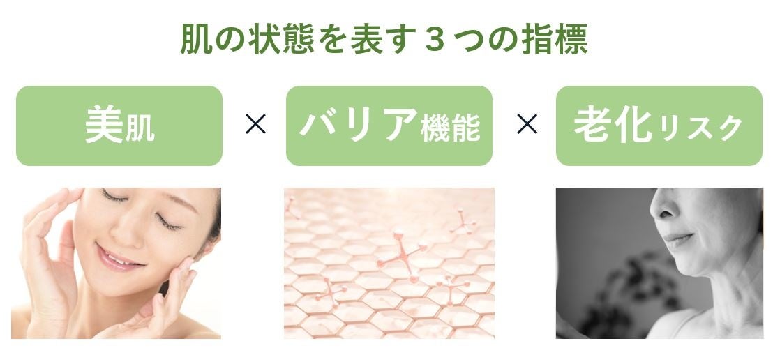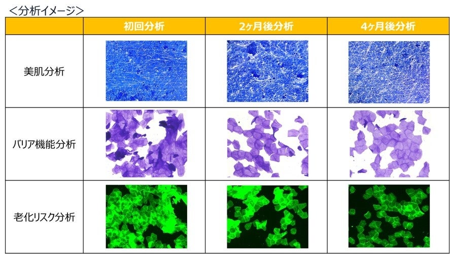 新しい肌分析サービスは、『他人との比較ではなく、“自分史上最高の肌”を目指す方をサポートする』ことをコンセプトとし、お客様の肌サンプルから<美肌>、<バリア機能>、<老化リスク>の3つの分析を行い、評価します。実際の角層細胞を染色し、バリア機能や細胞の酸化ダメージ(老化リスク)を見る手法を新たに取り入れ、細胞の状態を科学的に評価することで、肌内部で起きている事象を想定することが可能になりました。
