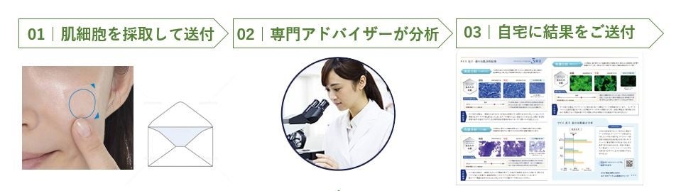 お客様ご自身の肌のサンプルを独自開発の「肌細胞分析システム」で解析することで、肌の美しさ(=美肌分析)、健やかさ(=バリア機能分析)、若々しさ(=老化リスク分析)の3つの視点で分析いたします。