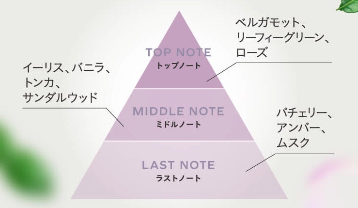 ふんわりとやわらかく香るローズシャボンの香りは清潔感と華やかさを両立した香りとなっています。