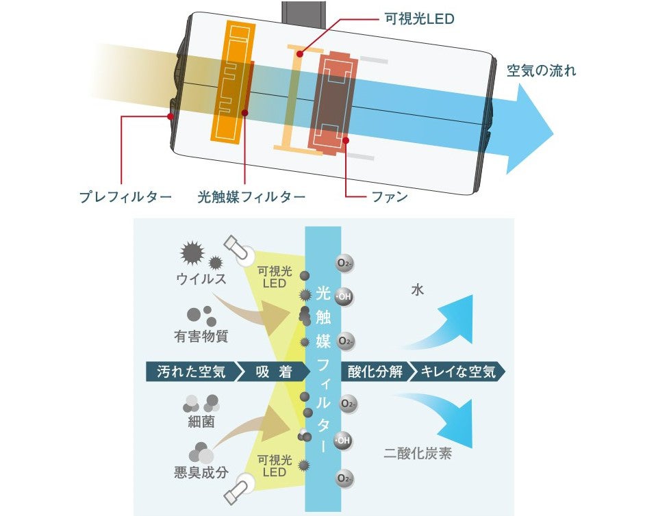 績・経験・知見と、カルテックの光触媒技術による空気清浄・水質浄化の先端的な知見を融合し、スポット型