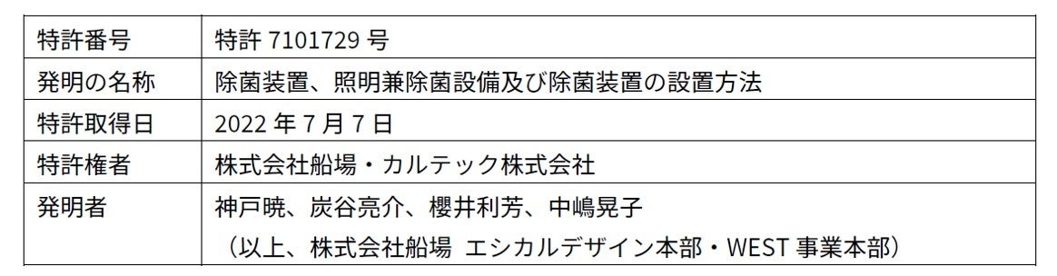 株式会社船場(本社:東京都港区 代表取締役社長 八嶋大輔 以下「船場」)は、光触媒技術による空気清浄・水質浄化の先端企業であるカルテック株式会社(本社:大阪府大阪市中央区 代表取締役社長 染井潤一 以下「カルテック」)と共同開発したスポット型光触媒除菌脱臭機「SPOT AIR(スポットエアー)」で使用されている除菌装置、照明兼除菌設備及び除菌装置の設置方法に関する技術の特許を取得したことをお知らせいたします。
