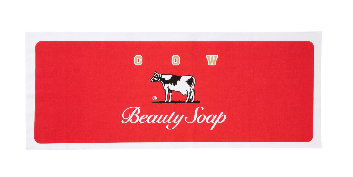 赤箱を大胆にデザイン。生地は牛乳石鹼の地元・大阪で捺染しました。顔や手の水気を拭うだけでなく、インテリアとしても飾って楽しめます。