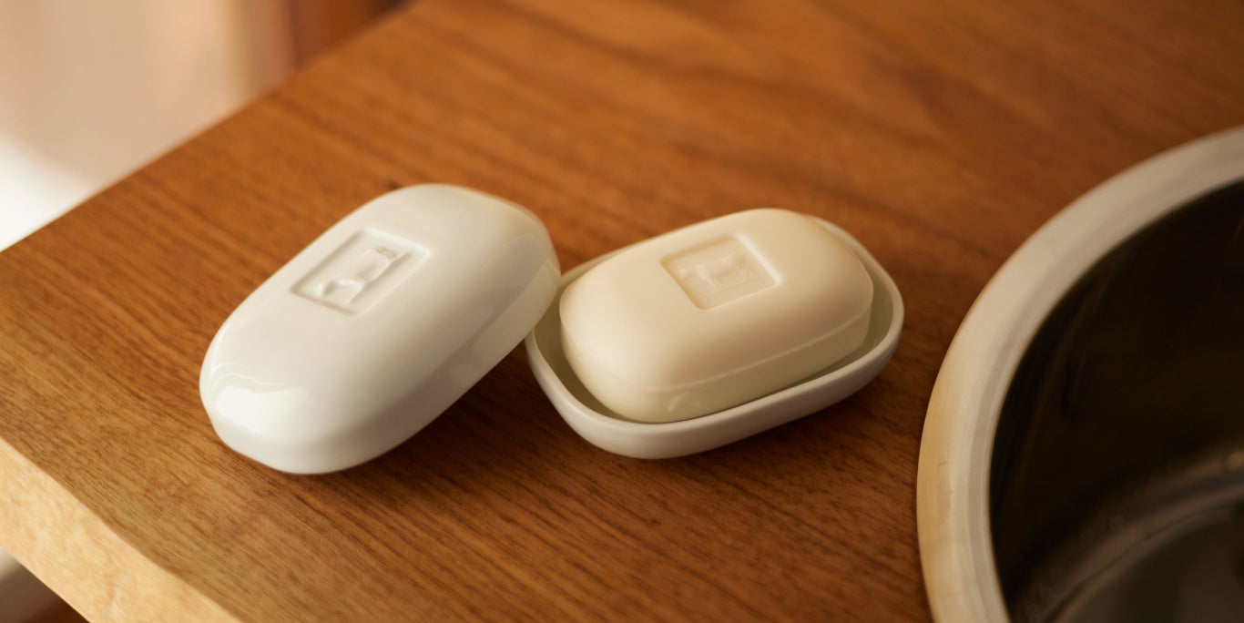 赤箱の石鹸の形を忠実に再現した波佐見焼の石鹸置き。蓋つきなので石鹸が水に濡れる心配がなく、安心してお使いいただけます。