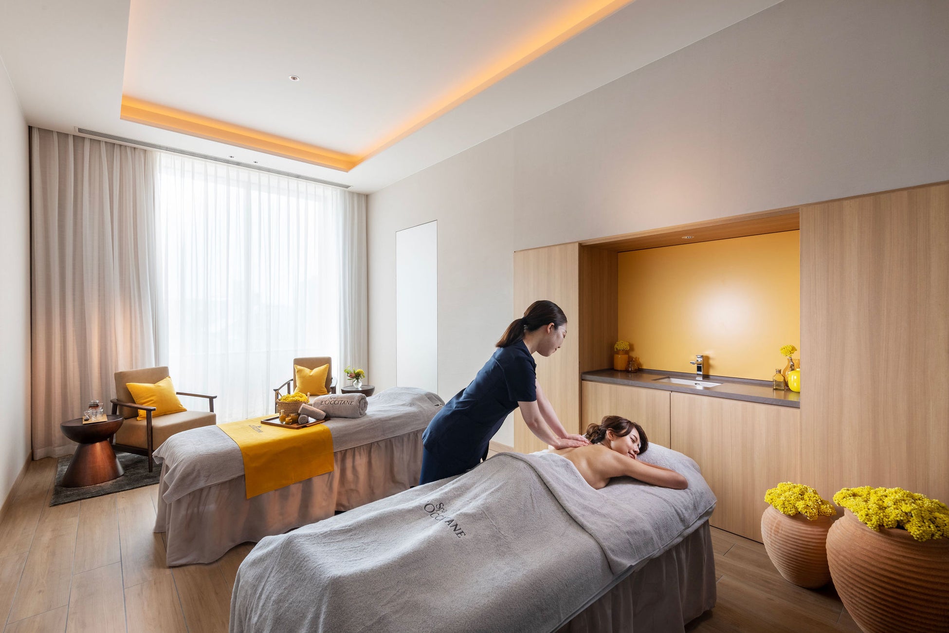 メニューはボディ、フェイシャルと、気軽にお試しいただけるフットやアイケアメニューもご用意。ロクシタンの心地よい香りに包まれながら、オールハンドの贅沢な施術をご堪能いただけます。また、レモンの生産量日本一の広島に着目し、この度ヒルトン広島限定のトリートメント2種類もご用意しました。「シトラス グロウ」(90分/¥27,346)は、ロクシタンで大人気の「シトラスヴァーベナ」を使用したボディトリートメントで、ジューシーでフレッシュな柑橘系の香りに包まれながら、ロクシタン独自の手技で緊張をほぐし、心も身体も開放します。フェイシャルとボディがセットになった贅沢な「プロヴァンサル ゴールデン ブリーズ」(120分/¥39,776)は、同じくヒルトン広島限定のシトラスの香りに包まれる至福のトリートメント。「シトラスヴァーベナ」の香りに包まれて、リラクシング効果の高いボディトリートメントで緊張をほぐした後は、美肌成分を豊富に含む花「イモーテル」の力が注ぎこまれたプレミアムスキンケア「イモーテル ディヴァイン」を用いたフェイシャルトリートメントを。ハリとツヤのある肌へと導きます。