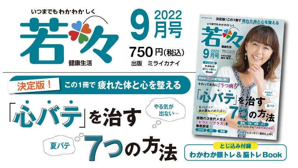今月の『若々』9月号は、「心バテを治す7つの方法」として、疲れた体と心を整えるのに役立つ記事を掲載しています。「眠れない」「疲れる」「気が重い」そう感じて病院に行くと「うつ病」と診断された。果たして本当にそれは「うつ病」なのでしょうか?様々なメンタル不調をクスリに頼らず治療に取り組む再発率ゼロの専門医に伺いました。また、着けるだけで集中力が上がる、疲れない次世代メガネ『セラピーグラス』をご紹介。目の疲れは脳や体にも影響してしまいます。パソコンやスマホをたくさん使う毎日にぴったりのメガネです。