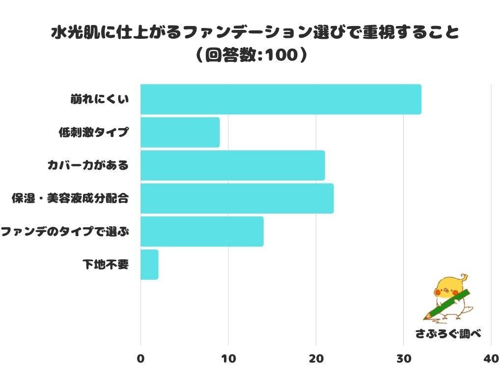 水光肌に仕上がるファンデーション選びで重視することをアンケートにて調査したところ、1位は「崩れにくい」でした。