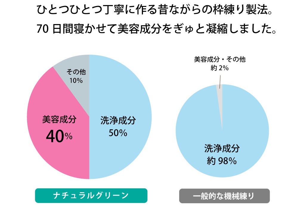 この製法は、一つひとつ丁寧に70日間ゆっくり寝かせながら水分を飛ばして作るため、美容成分をたっぷり約30%まで配合した溶けにくい石鹸に仕上げることができます。さらに、時間をかけることで肌にとって不要な成分(発泡剤・凝固剤)を配合する必要もなくなります。