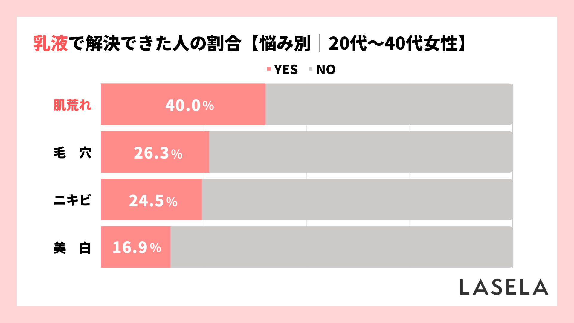この結果を、抱えている悩み別で見てみると、乳液で症状を改善できた割合が最も高かったのは「肌荒れ」で40.0%、続いて「毛穴(26.3%)」、「ニキビ(24.5%)」となりました。この中で最も低かったのは「美白」で、16.9%となっています。