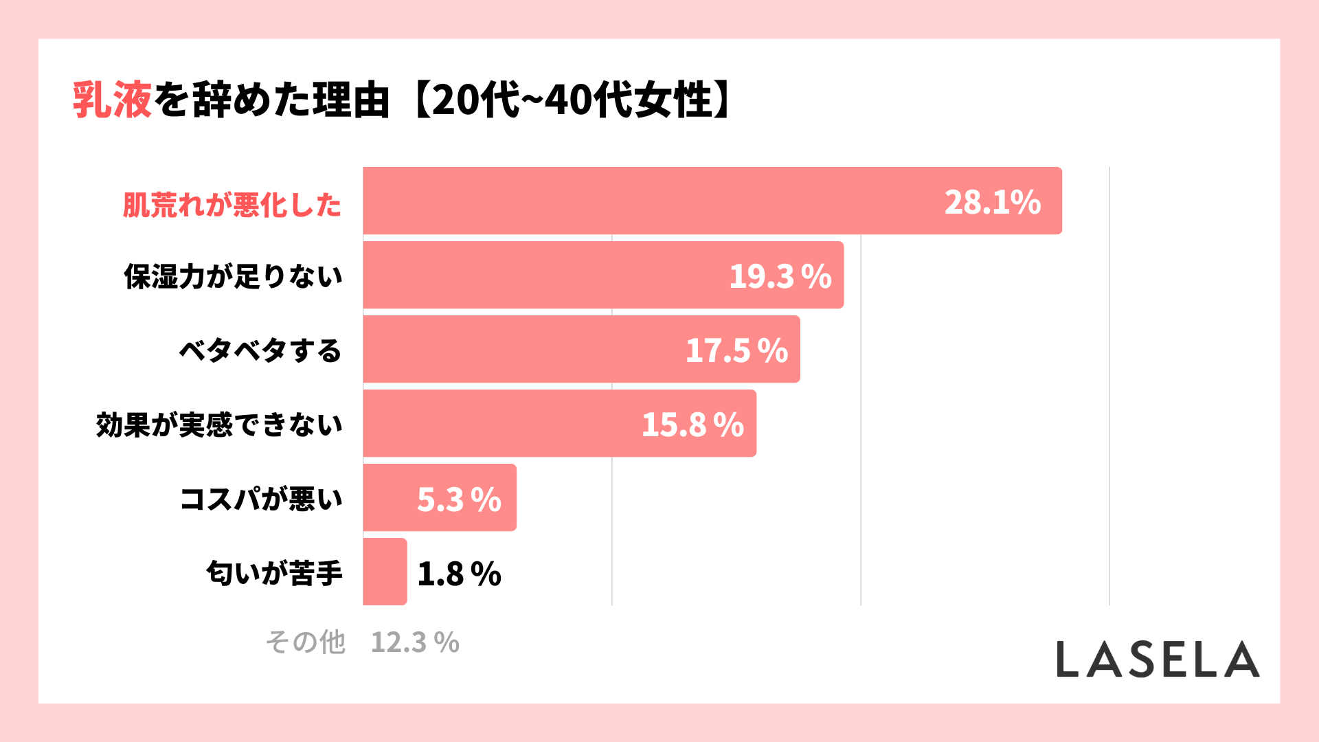 • 乳液を辞めた理由TOP3は「肌荒れの悪化」「保湿力が足りない」「ベタベタする」