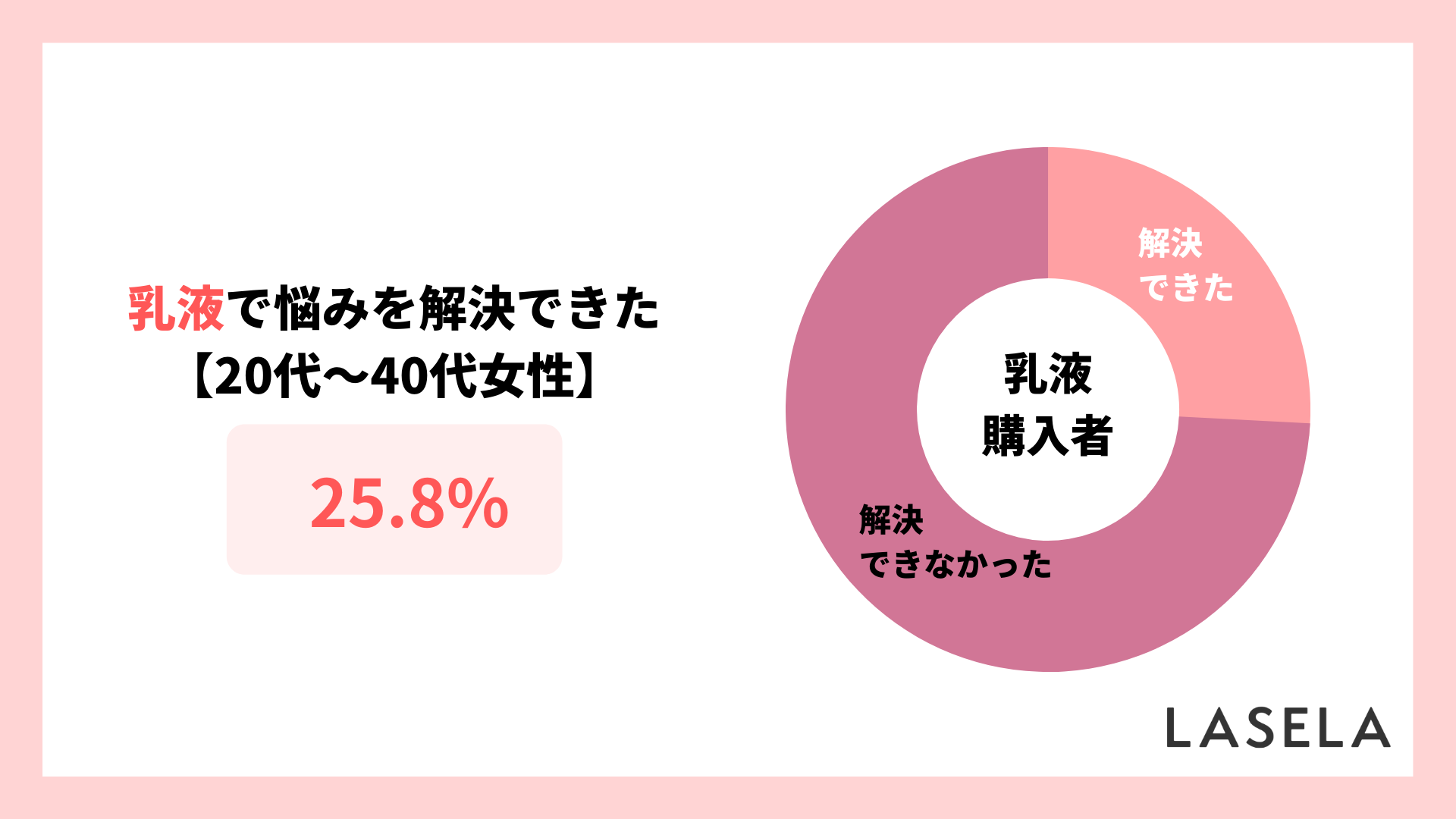 乳液を購入した414人に、症状を改善できたかをたずねたところ、「できた」が25.8%、「できなかった」が74.2%でした。乳液を購入した約3割が、肌トラブルを解決することができたようです。