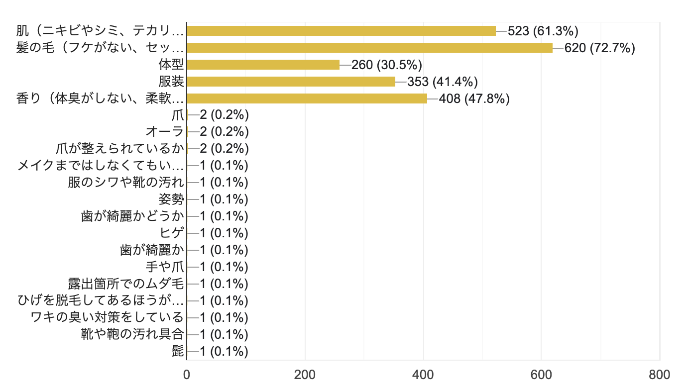 髪の毛(フケがない、セットされている等)が最多で72.7%、肌(ニキビやシミ、テカリがない等)が61.3%。
