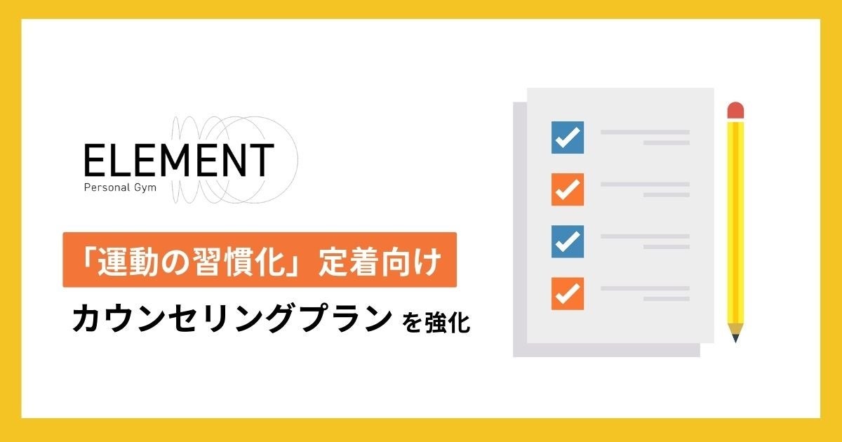 本プランでは、入会前と月1回定期的に実施するカウンセリングにて、運動の習慣化の実現にむけたトレーニングプランの設計を支援します。これまでもELEMENTでは、お客様に対してカウンセリングを実施しておりましたが、お客様の体型や生活リズム、性格、目指すゴールをもとに、より「運動の習慣化」特化したカウンセリングを実施することで習慣化を定着させるためのプランをお客様とともに設計いたします。