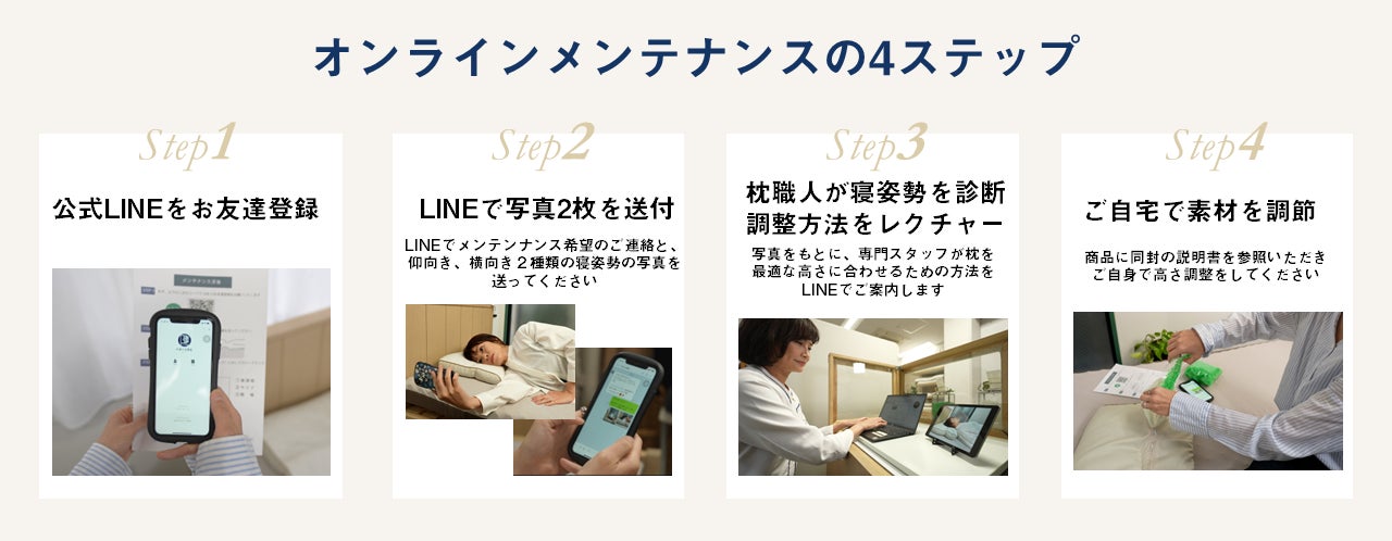 オーダーメイド枕は、メンテンナンスが命です。ご自宅の睡眠環境にあった枕を使い続けていただくために、業界最高水準の無料メンテンナンス期間を設けるなど、メンテナンスの質を追求してきました。しかしながらコロナ禍で来店が難しい状況が続いたり、店舗が遠方などの理由でメンテナンスが難しいお客様がいらっしゃいました。そこで、経験豊富な枕職人3名を『オンラインまくら調整師』として配置し、オンラインメンテナンスサービスを開始いたしました。現在ECサイトでもオーダーメイド枕のオーダーが可能なため、購入から日々のメンテナンスまでを、全てオンラインでご提供しております。