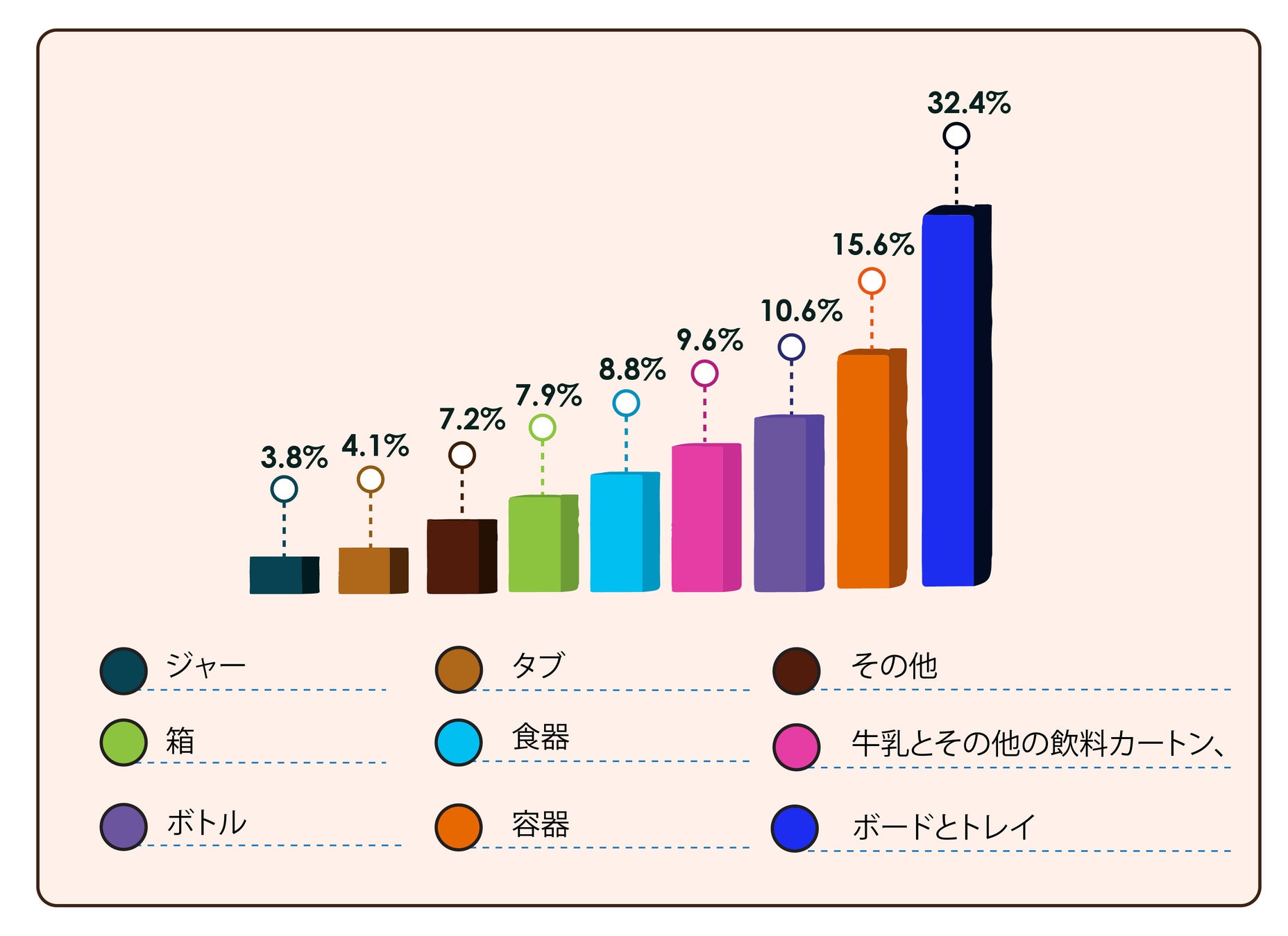 2021年の市場シェアは、紙・板紙セグメントが最も高い。紙・板紙分野は、ラミネートやコーティングによる防水性などの機能性を高め、ベーカリー製品や外食用途に幅広く適用されていることから、2021年の市場シェアは約40.7%となった。