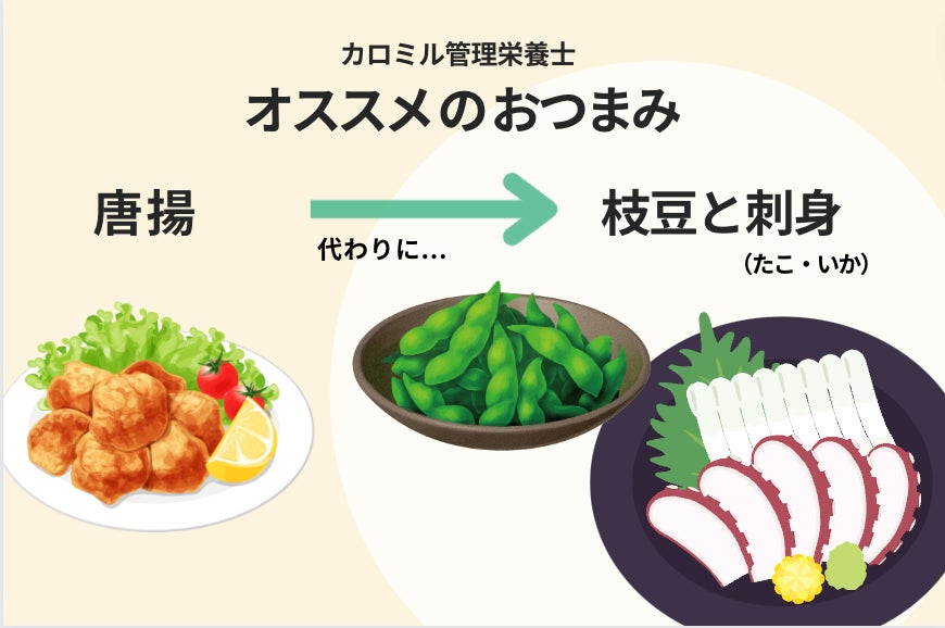 飲酒の適量を知り、おつまみを工夫しながら、カロミルで食事記録をつけて、楽しくお酒を飲んでいきましょう。