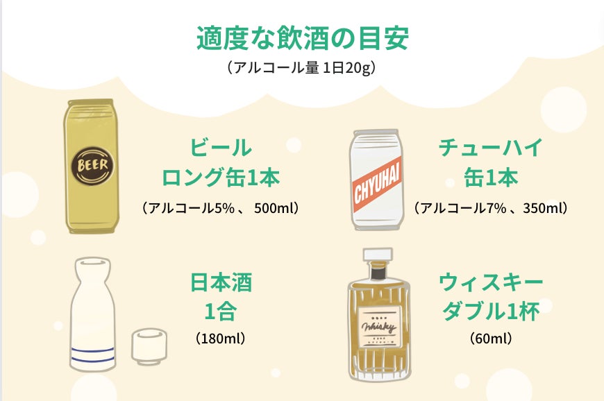 適度な飲酒の目安はアルコール量1日20g程度と言われています。※