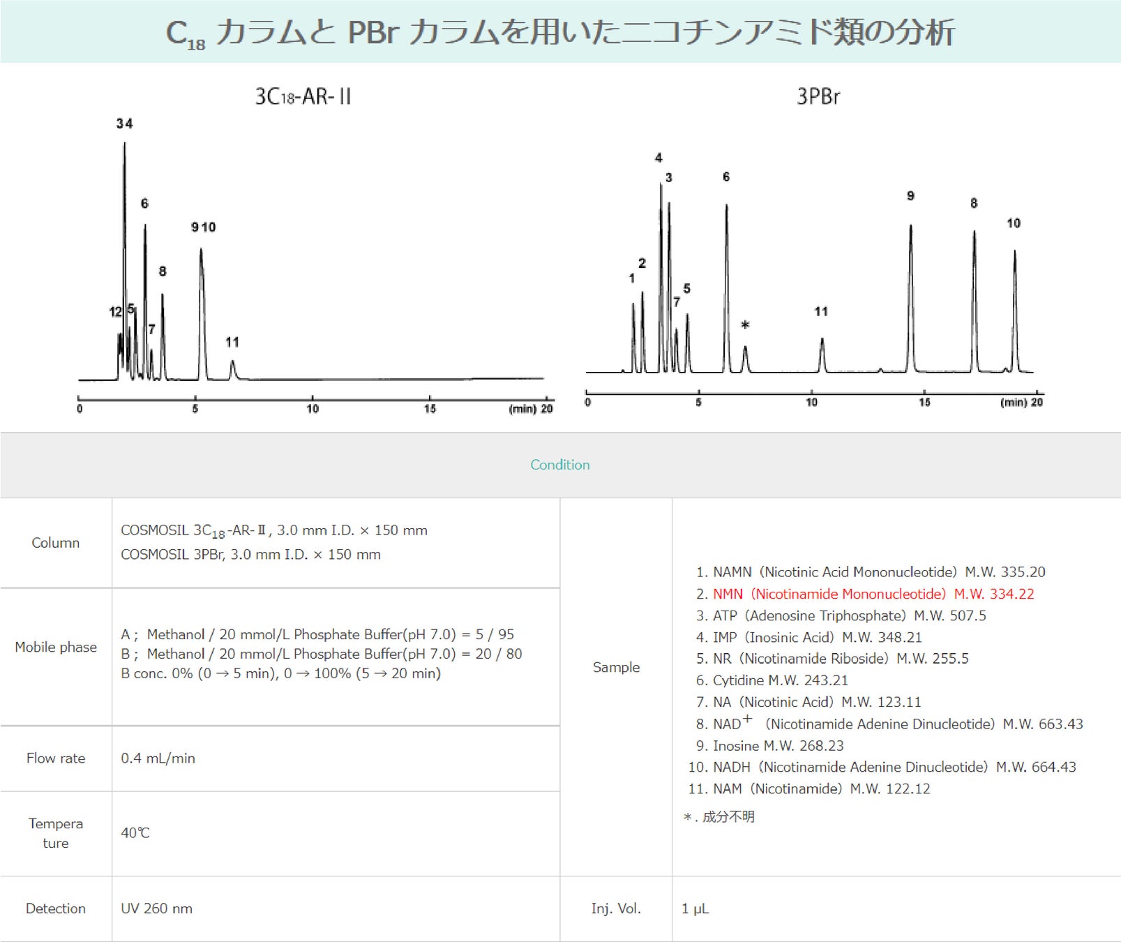 ナカライテスク株式会社(本社:京都市中京区、代表取締役社長:半井大、以下、「ナカライテスク」)は、この度、食品中に含有している老化防止やがんの抑制に作用することで知られているニコチンアミドモノヌクレオチド(NMN)とその代謝物を、逆相高速液体クロマトグラフィー(逆相HPLC)を用いることで、分離して検出することができました。本研究成果は「Analytical Biochemistry」に掲載されました。