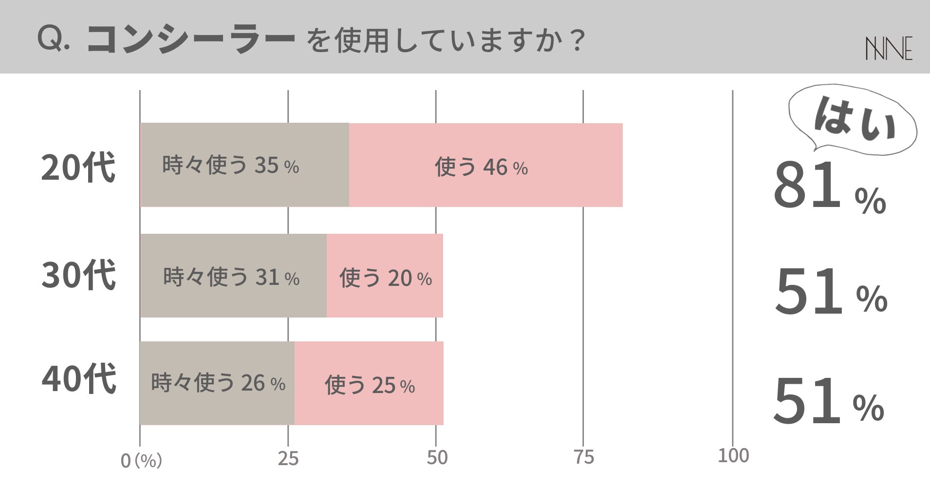 肌悩みが増えてくる30~40代よりも20代の方が割合が多いのが意外な結果でしたが、20代では「ファンデは使わず気になる部分だけコンシーラーで」という使い方もポピュラーなようです。