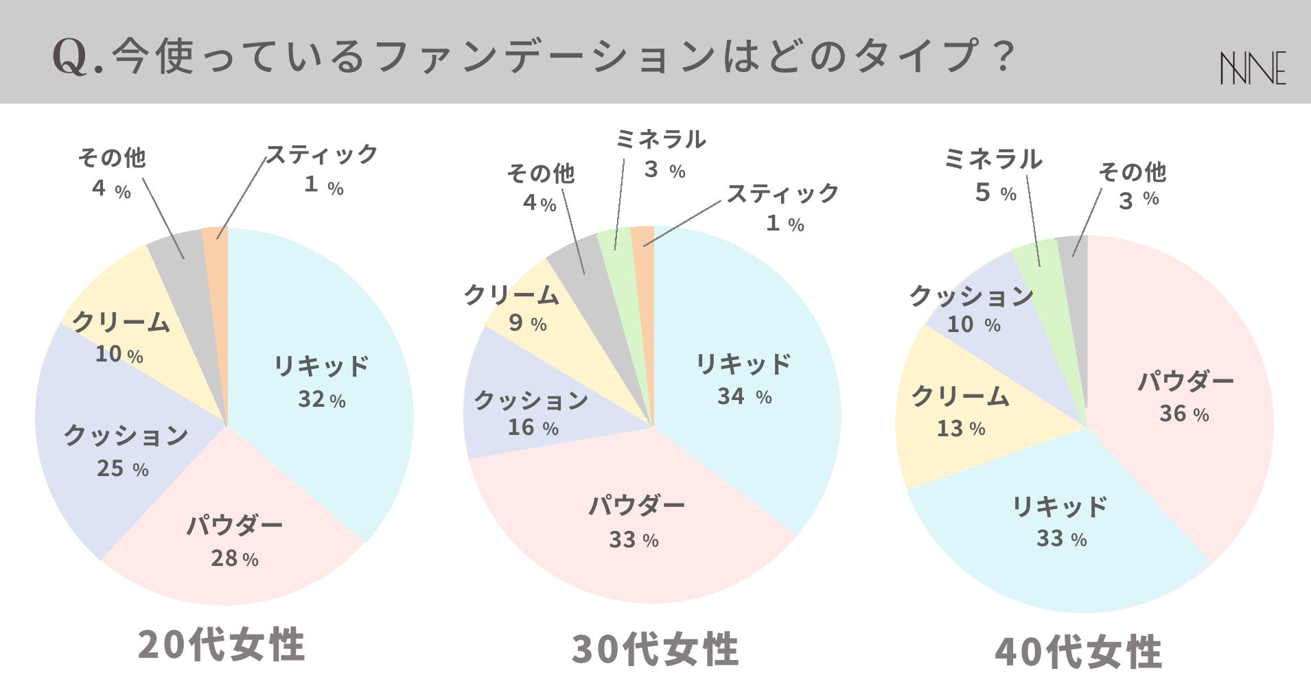 「現在使っているファンデーションのタイプは何ですか?」というアンケートでは、20代、30代はパウダー、リキッド、クッションの3つを柱に他タイプが続き、40代はパウダー、リキッドの2本柱にクリーム、クッションと続きました。