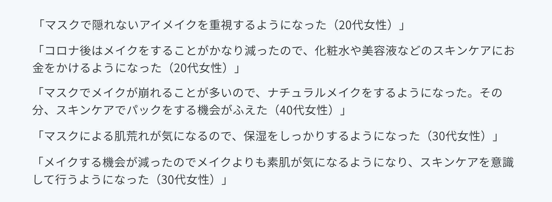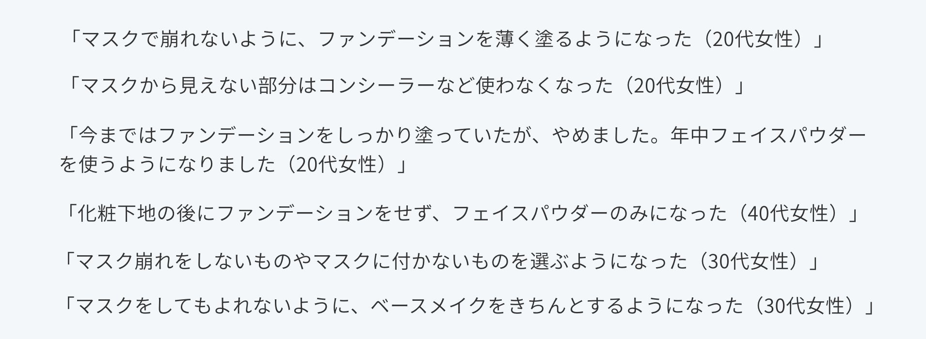 具体的には、「マスク崩れしないように」「マスクにつかないように」「マスクでほとんど隠れるので」と、やはりマスクに関連しての変化がほとんど。