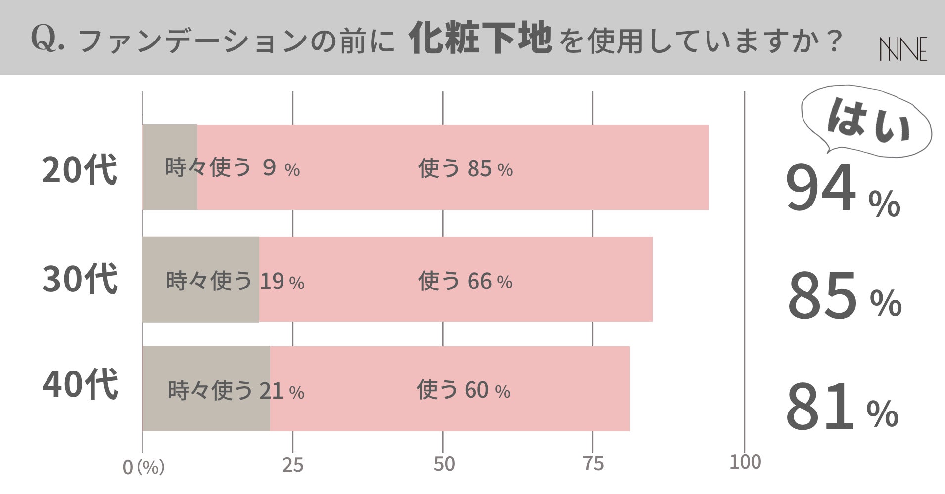 年代別で言うと、20代においては「化粧下地」が「ファンデーション」を若干超え、ほぼ同じ割合に。