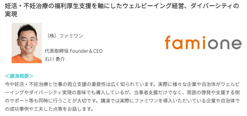 「子どもを願うすべての人によりそい 幸せな人生を歩める社会をつくる」をビジョンに掲げ、LINEを活用した妊活コンシェルジュサービス「famione(ファミワン)」 https://lp.famione.com/ を提供する株式会社ファミワン(本社:東京都渋谷区、代表取締役:石川勇介、以下当社)の代表取締役の石川がRX Japan株式会社主催の「第1回 Femtech Tokyo」に登壇いたします。
