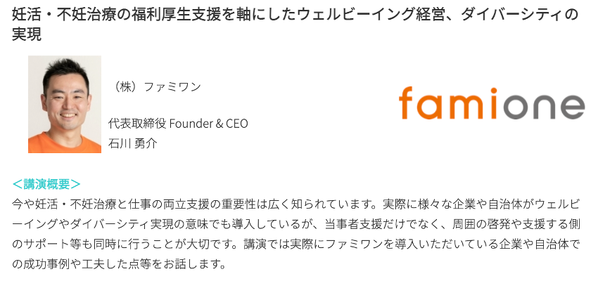 「子どもを願うすべての人によりそい 幸せな人生を歩める社会をつくる」をビジョンに掲げ、LINEを活用した妊活コンシェルジュサービス「famione(ファミワン)」 https://lp.famione.com/ を提供する株式会社ファミワン(本社:東京都渋谷区、代表取締役:石川勇介、以下当社)の代表取締役の石川がRX Japan株式会社主催の「第1回 Femtech Tokyo」に登壇いたします。
