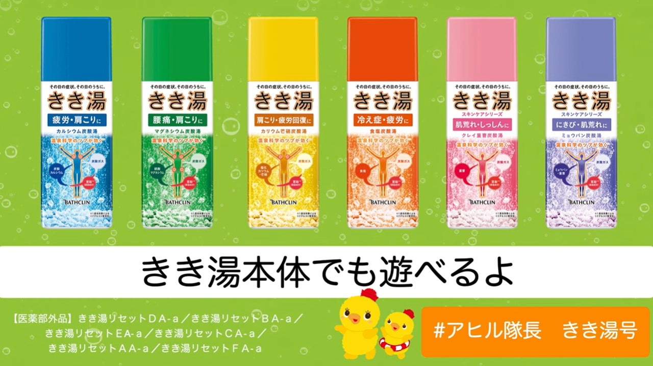 薬用入浴剤「きき湯」の発泡の力で、かわいらしい「アヒル隊長」がお湯の表面をすいすいと進みます。お子様が楽しめるだけでなく、「きき湯」が温浴効果を高めて、疲労をラクにし、ご家族でからだケアをしていただけます。親子のふれあいツールとしての活用や、ご自宅でのお風呂時間の充実に、ぜひお試しください。