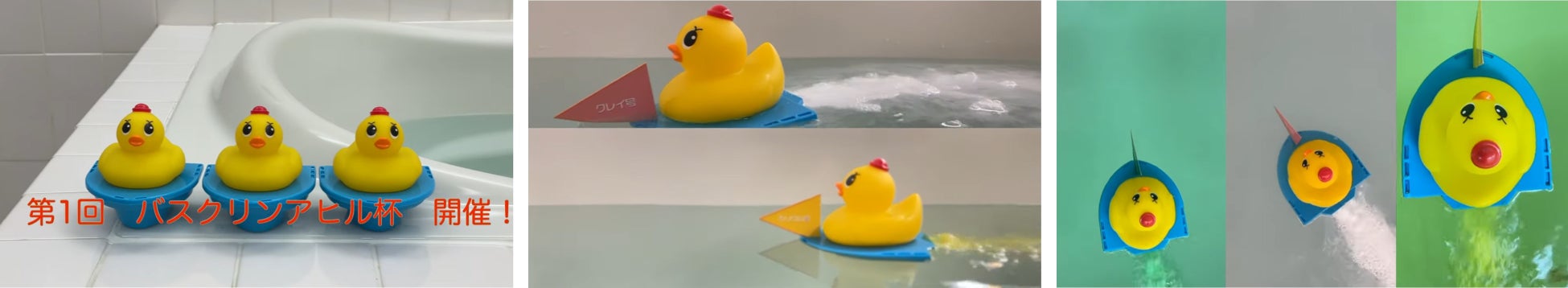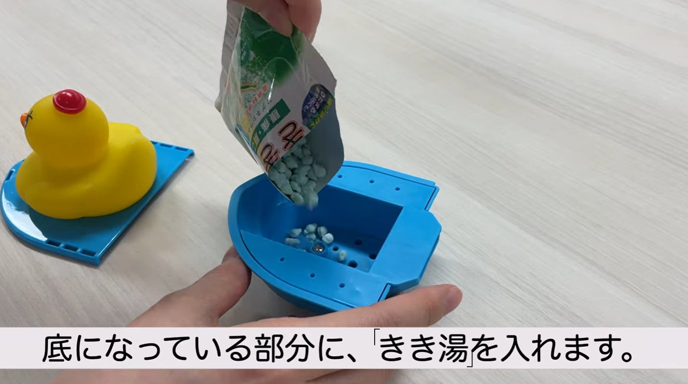・「きき湯」を「アヒル隊長」専用ボートにセットしてお風呂に浮かべると、「きき湯」の発泡の力で「アヒル隊長」がすいすいと湯面を進みながら、炭酸ガスがお湯に溶け込みます。