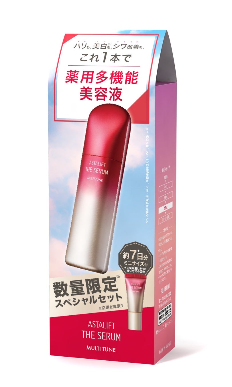 肌にのせた瞬間にとろける、シワ改善・美白※有効成分ナイアシンアミド配合の薬用美容液が新発売。ザ セラム マルチチューンのミニサイズが約7日分付いた限定セット。