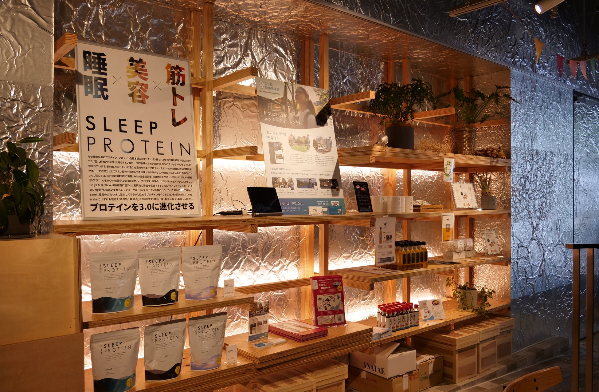 期間限定ショップでは、SleepプロテインのRelax・Deep・Wakeの全商品を実際に手に取って店頭で購入できます。