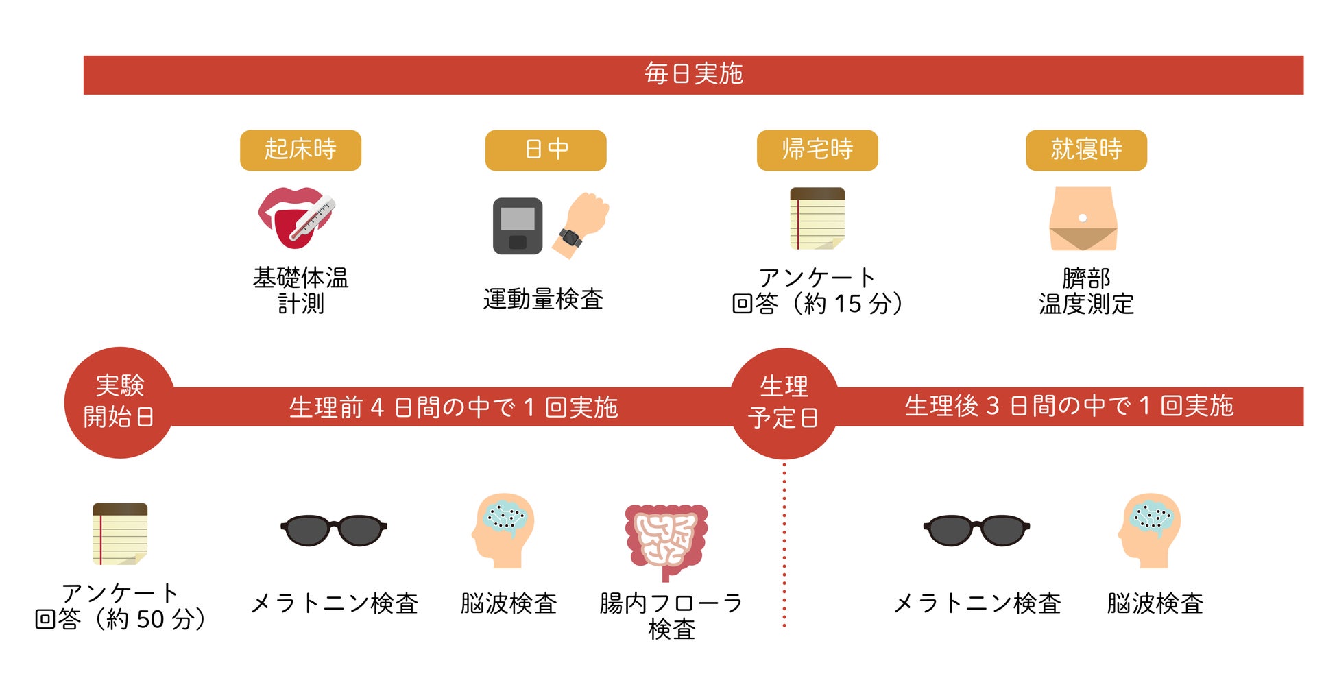実験実施日 9月または10月の生理予定日の4日前から生理日、生理開始後3日間(予定日が後ろ倒しになった場合は延泊)
