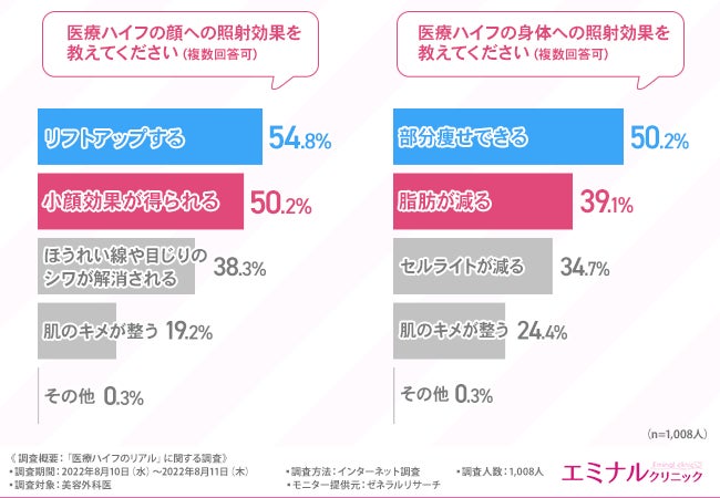 先程の調査で、医療ハイフの顔・身体への照射効果を尋ねたところ、それぞれリフトアップと部分痩せが最多の回答でした。