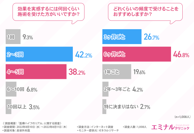 ここまでの調査で、8割近くの方が、効果を実感するには最低でも2回以上の施術が必要であり、7割以上の方が少なくとも半年ごとに施術を受けることをすすめています。