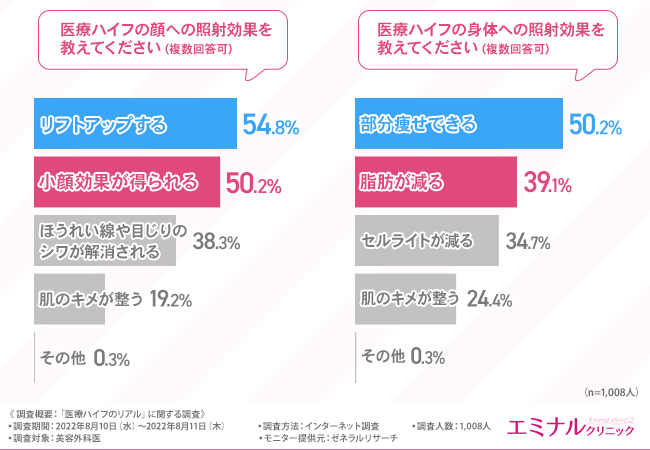 先程の調査で、医療ハイフの顔・身体への照射効果を尋ねたところ、それぞれリフトアップと部分痩せが最多の回答でした。