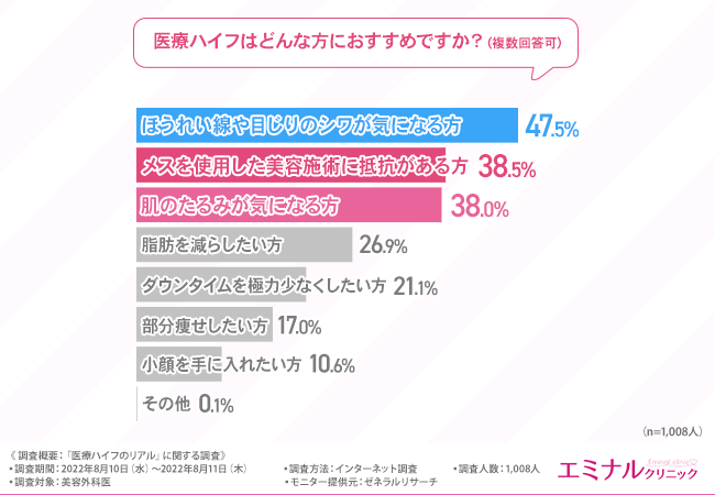 「医療ハイフはどんな方におすすめですか?(複数回答可)」と質問したところ、『ほうれい線や目じりのシワが気になる方(47.5%)』と回答した方が最も多く、次いで『メスを使用した美容施術に抵抗がある方(38.5%)』『肌のたるみが気になる方(38.0%)』と続きました。