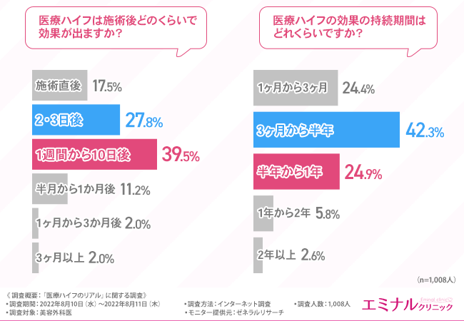 「医療ハイフは施術後どのくらいで効果が出ますか?」と質問したところ、『1週間から10日後(39.5%)』と回答した方が最も多く、次いで『2・3日後(27.8%)』『施術直後(17.5%)』と続きました。
