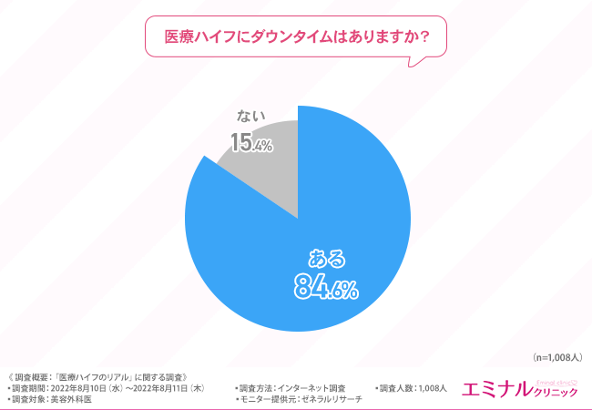 「医療ハイフにダウンタイムはありますか?」と質問したところ、『ある(84.6%)』『ない(15.4%)』という結果となり、8割を超える圧倒的多数の美容外科医がダウンタイムがあると回答しています。