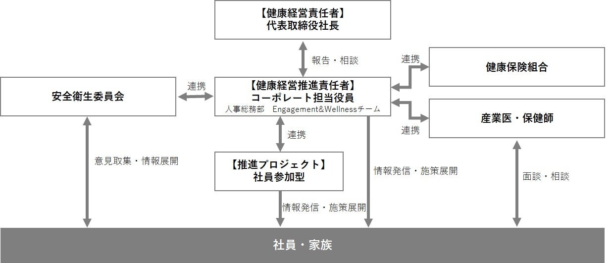 推進にあたっては代表取締役社長を健康経営の責任者とし、経営的な視点から全体の健康経営を推進していきます。健康経営推進責任者が健康経営推進事務局となり、安全衛生委員会、産業医・保健師と連携して、社員の自主的な健康への取り組みを行えるよう各種情報発信・施策展開を行っています。