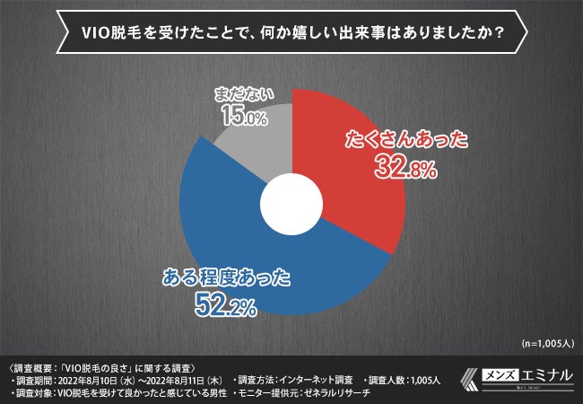 「VIO脱毛を受けたことで、何か嬉しい出来事はありましたか?」と質問したところ、8割以上の方が『たくさんあった(32.8%)』『ある程度あった(52.2%)』と回答しました。