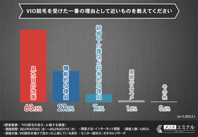 「VIO脱毛を受けた一番の理由として近いものを教えてください」と質問したところ、『見た目の改善(63.3%)』と回答した方が最も多く、次いで『機能的な理由(27.2%)』『結婚や介護など将来的な理由(7.1%)』と続きました。