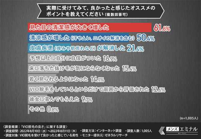 「実際に受けてみて、良かったと感じたオススメのポイントを教えてください(複数回答可)」と質問したところ、『見た目の清潔感が大きく増した(61.6%)』と回答した方が最も多く、次いで『清涼感が増した(汗やムレ、ニオイの解消を含む)(50.4%)』『皮膚疾患(痒みや肌荒れなど)が解消した(21.4%)』と続きました。