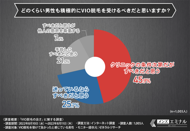 「どのくらい男性も積極的にVIO脱毛を受けるべきだと思いますか?」と質問したところ、『クリニックの条件次第だがすべきだと思う(45.9%)』と回答した方が最も多く、次いで『迷っているならすべきだと思う(25.7%)』『手放しにすべきだと思う(21.0%)』と続きました。