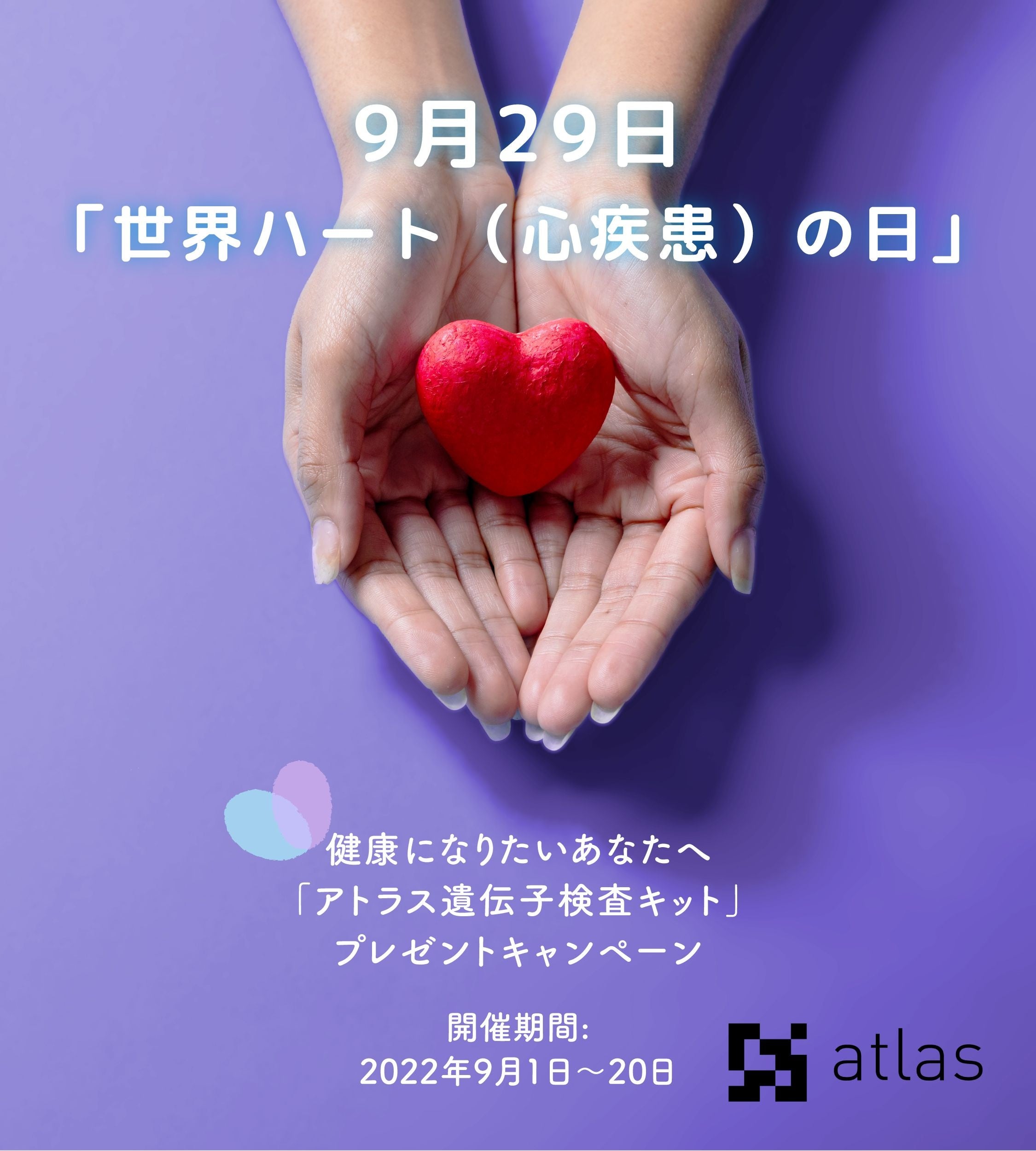 心疾患を予防するには生活習慣を見直すこと、運動習慣を続けることなどが重要なポイントです。Atlas Japan では、世界ハートの日を記念し、検査キットを通じて、生活習慣を見直すきっかけにしていただければと考え、人気の遺伝子検査キットプレゼントキャンペーンを実施します。