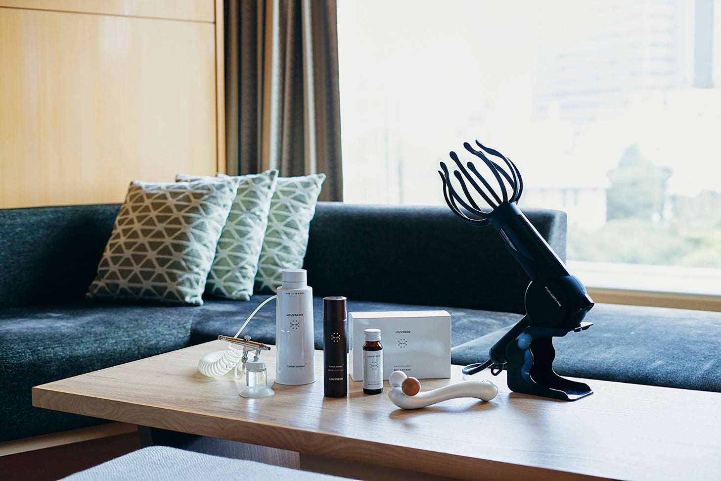 アメニティは、人の持つ本来の美しさを追求する「LOUVREDO」によるラインナップで、第一弾でも翌朝のお肌のやわらかさを実感されるお客様が多かった 飲む美容液「レヴィ インナーエステメルモ」の他、手軽に炭酸ケアを愉しめる「レヴィ ミストローション」、エステティシャンのハンド技術を再現したボディマッサージローラー「レヴィ ソフィル-e ホワイト」などをご用意。中でも注目したいのは、低温の風で、髪だけでなく顔や身体にまで使える「復元ドライヤーPro」で、サウナの間に愉しむ外気浴の代わりに全身にあててボディケアするのがおすすめです。