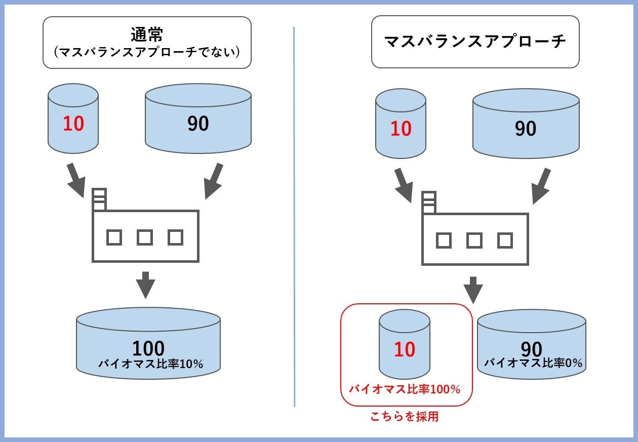 例えば、原料に1割のバイオマス由来原料を投入すれば、1割の製品が100%バイオマスプラスチックとみなされます。