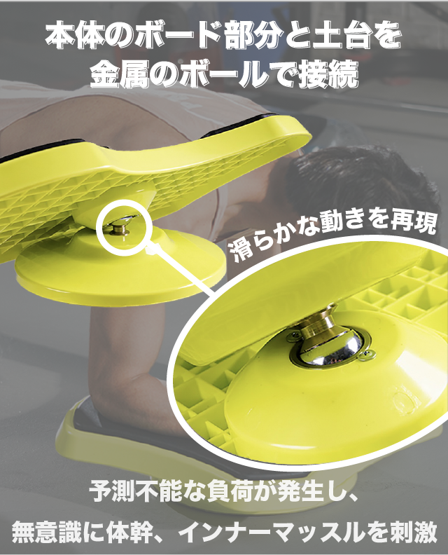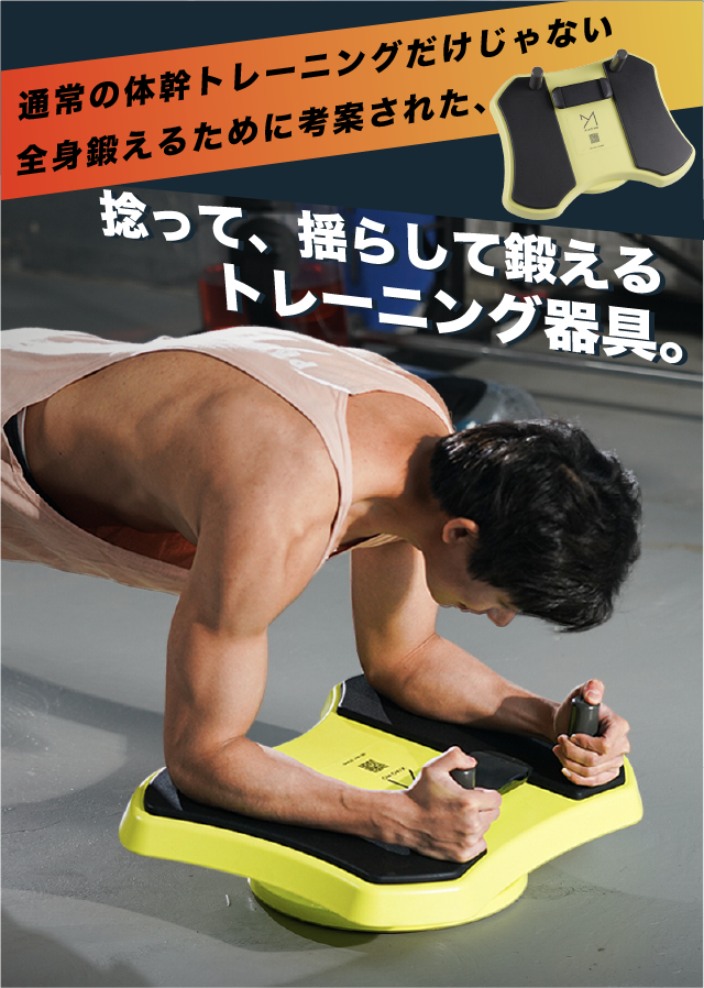 mobifitness CoreTrainerは体幹トレーニングの代表である「プランク」に「捻り、揺らし」を加えたエクササイズが可能です。