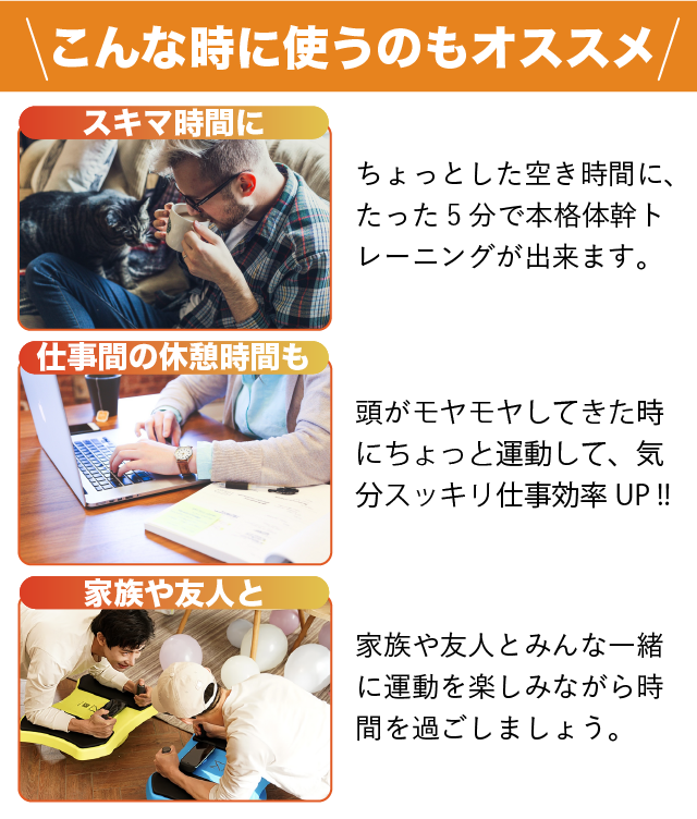 毎日のトレーニングや運動に1日5分のmobifitness CoreTrainerを使った運動を取り入れて継続的に身体づくりをしましょう。